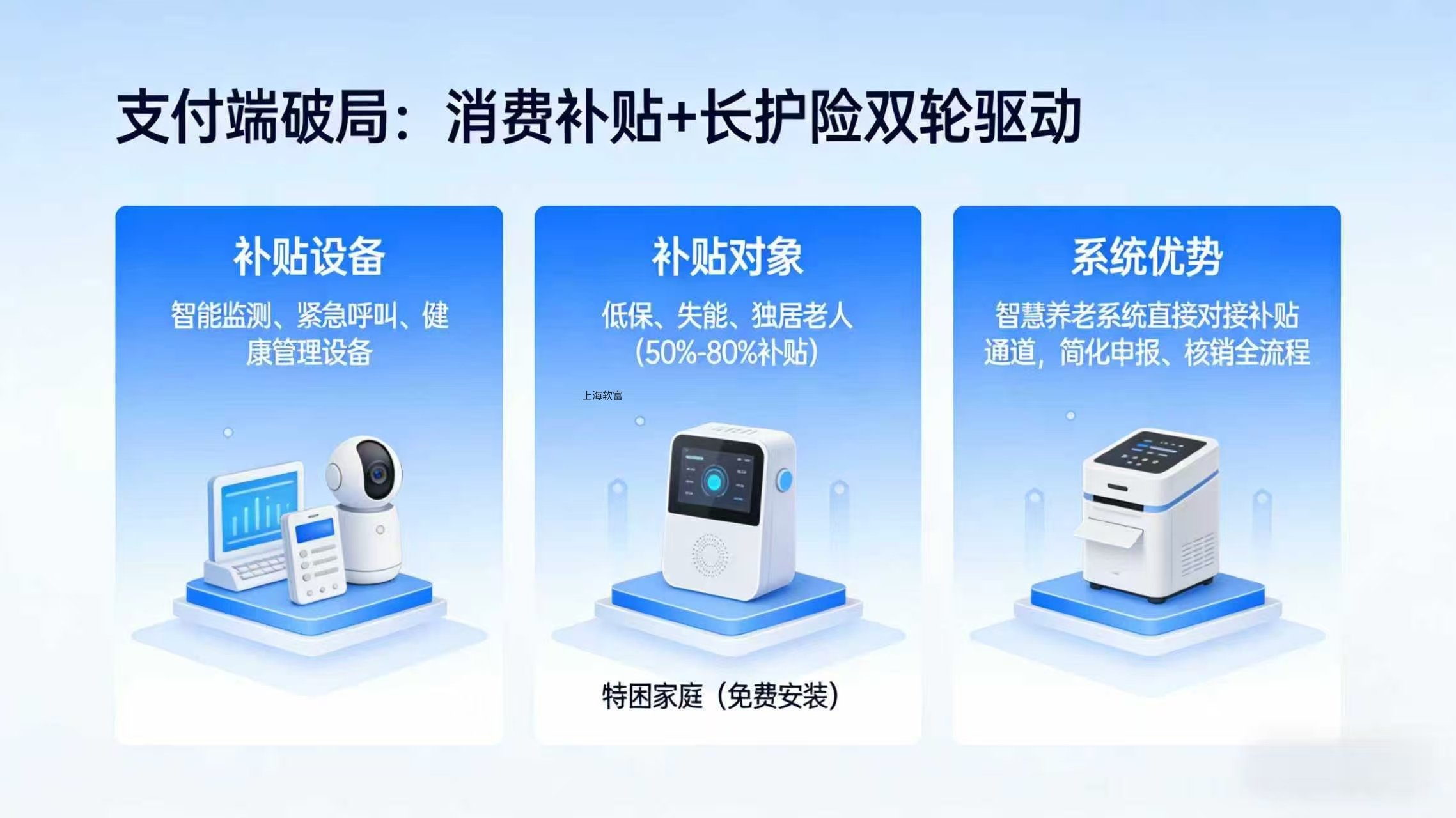 特别值得关注的是,智能监测、紧急呼叫、健康管理等设备已被纳入补贴目录,低保、失能、独居老人可享受50%-80%的补贴,特困家庭甚至可以免费安装。这意味着智慧养老系统可以直接对接补贴通道,简化申报、核销全流程。
