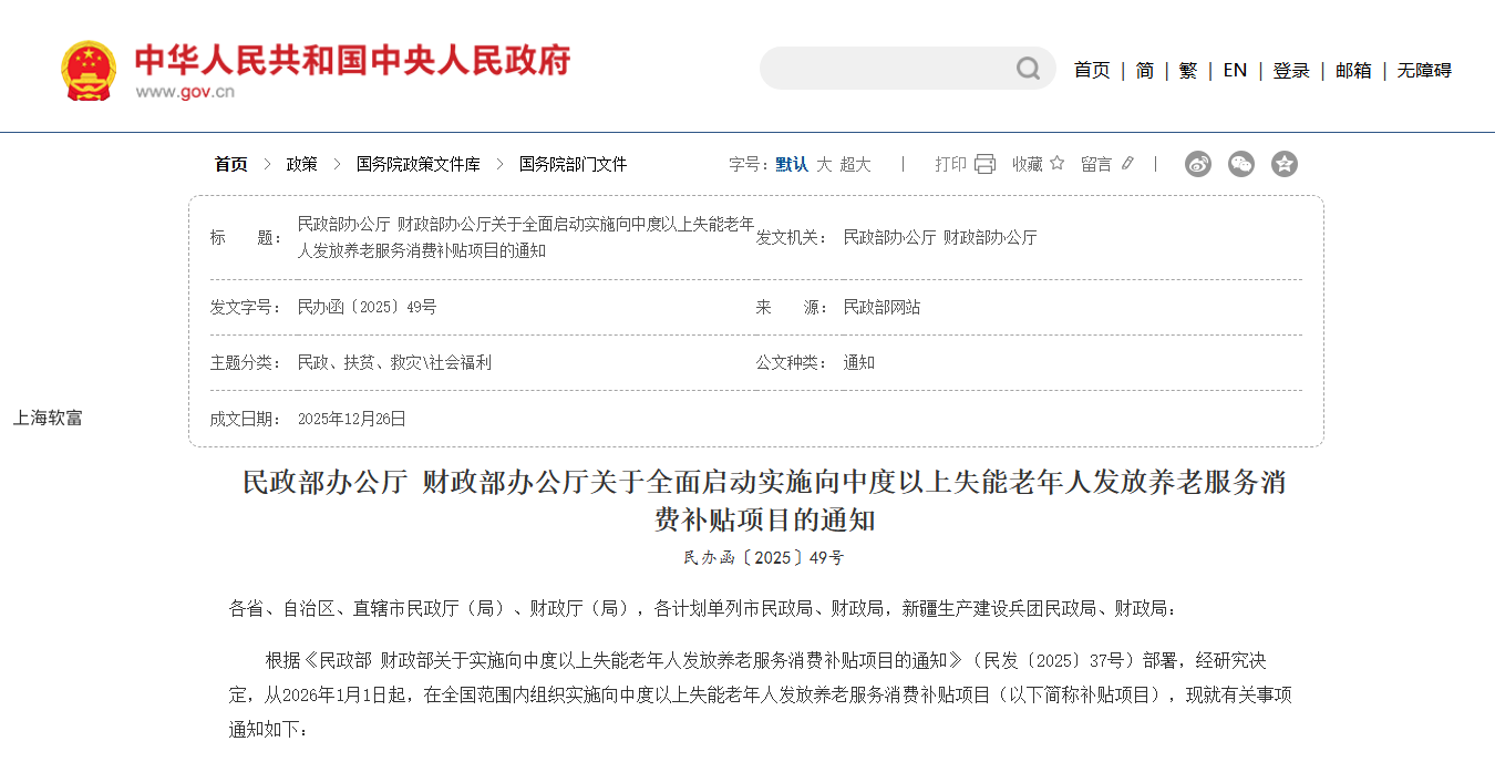 2025年12月26日年全国推行中度以上失能老人养老服务消费补贴,每月最高800元,智能监测、紧急呼叫、健康管理等设备纳入补贴目录,低保、失能、独居老人补贴 50%-80%,特困家庭可免费安装。智慧养老系统可直接对接补贴通道,简化申报、核销全流程。