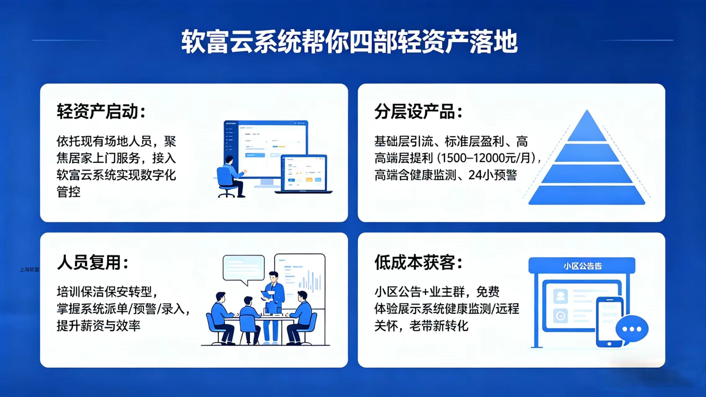低成本获客:依托小区公告、业主群,推出免费体验与老带新,体验期间可展示软富云系统的健康监测、远程关怀等功能,增强业主信任度,提升转化。